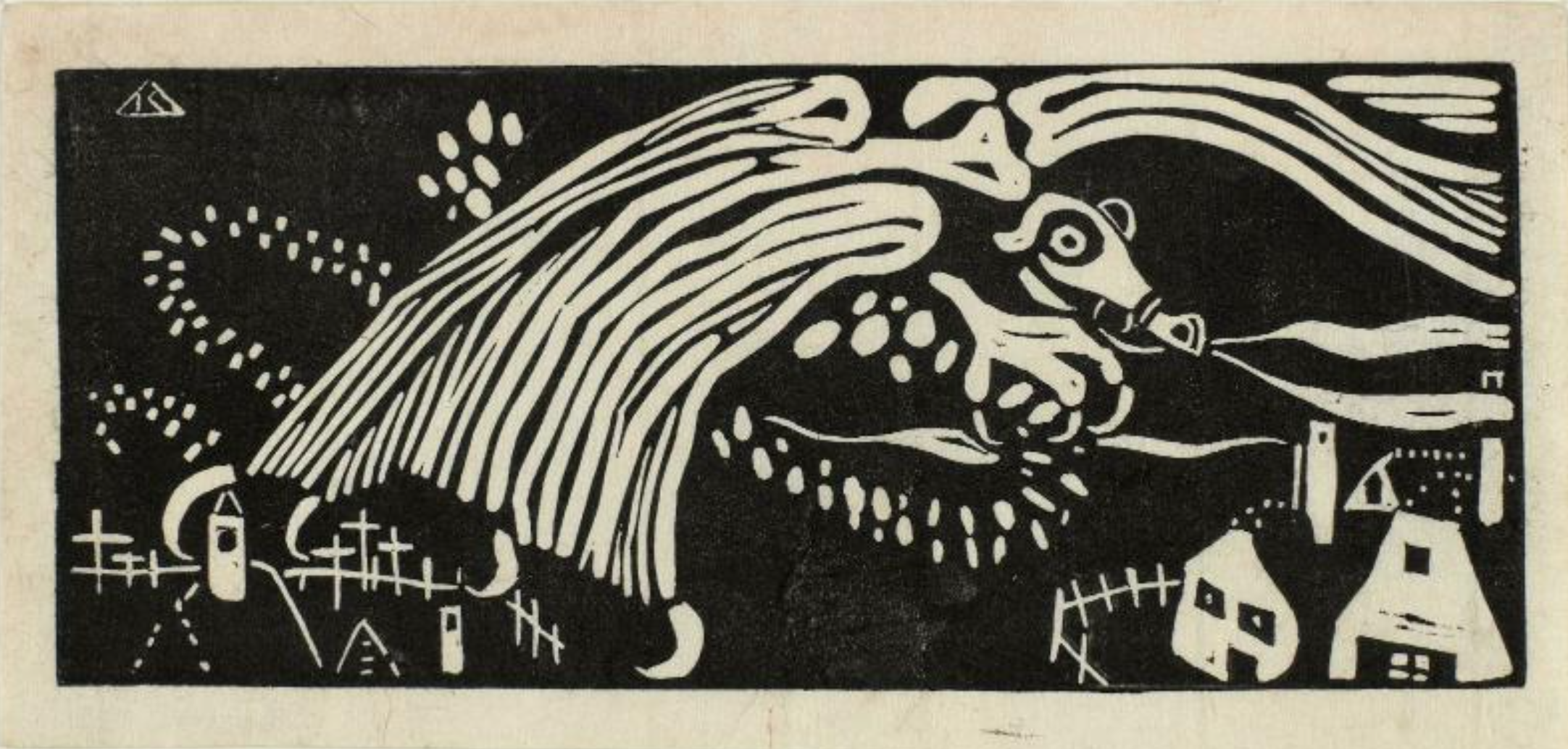Vassily Kandinsky, Baba Jaga (1907), xylographie sur papier, 8 x 17 cm, Centre Pompidou, Paris.