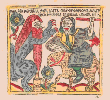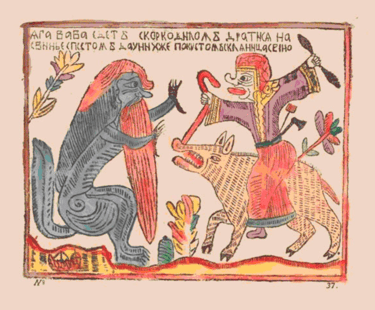 Baba Yaga jambe de bois part combattre à dos de cochon le karkadil avec son pilon. Il y a du vin (vers 1760) dans Russkie narodnye kartinki de Dimitri Rovinskij, vol. 1, Saint-Pétersbourg, 1900, p. 273-274.