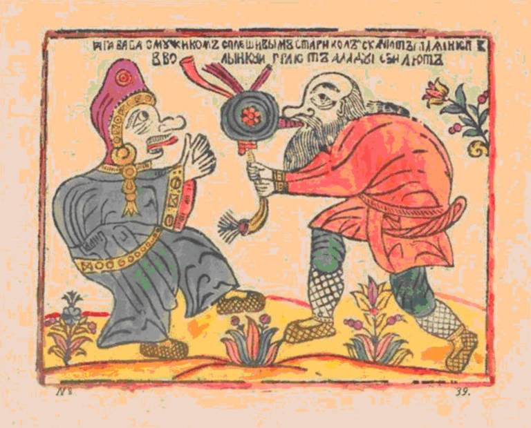 Baba Yaga et le moujik (vers 1760) dans Russkie narodnye kartinki de Dimitri Rovinskij, vol. 1, Saint-Pétersbourg, 1900, p. 273-274.