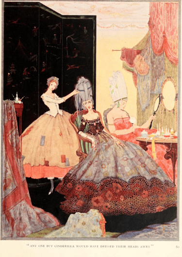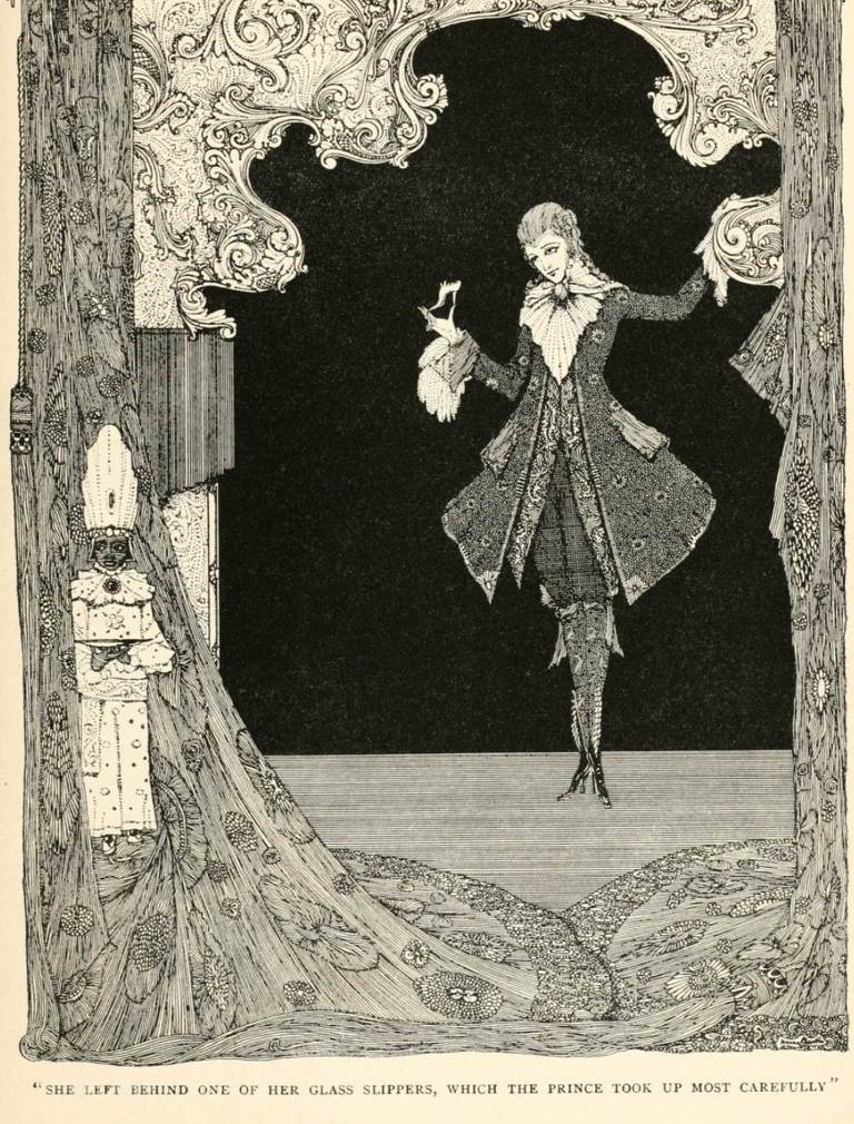 Harry Clark, illustrations pour Cinderilla ; or, The Little Glass Slipper (Cendrillon ou la petite pantoufle de verre) dans The fairy tales of Charles Perrault (Contes de Charles Perrault)(1922), London : Harrap, p. 77, 78, 81, 87.