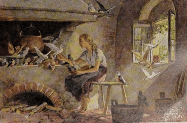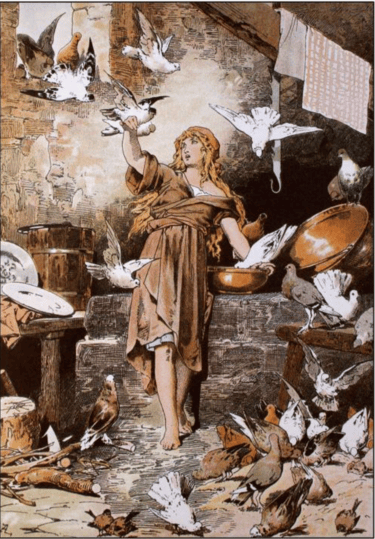 Carl Offterdinger, illustrations pour Aschenputtel ou Cinderella (Cendrillon)(vers 1890) dans Children’s and Household Tales collected by the brothers Grimm (Contes de l’enfance et du foyer collectés par les frères Grimm), Guildford Scientific Press, Lord Henfield, 2022, p. 37-38.