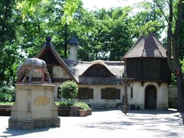 Représentation de Petite-table-sois-mise, l'Âne-à-l'or et Gourdin-sors-du-sac, Bois des contes, Efteling, Pays-Bas, photographie d'Eliedion, 2006.