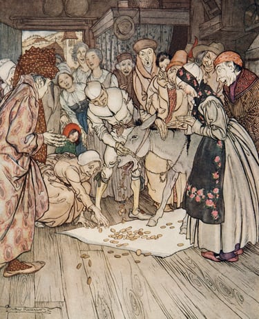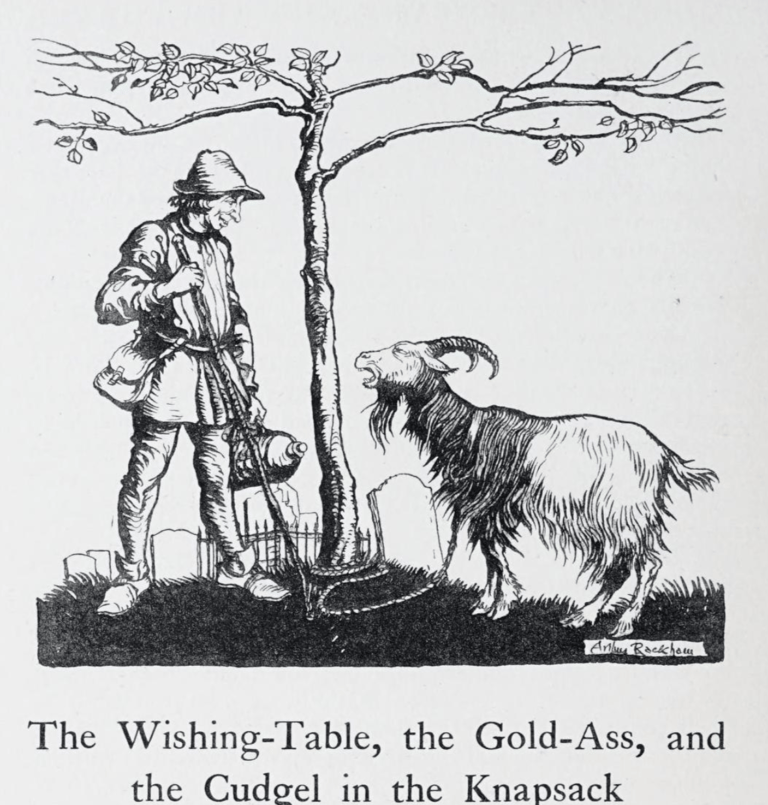 Arthur Rackham, illustrations pour The Wishing-Table, the Gold-Ass, and the Cudgel in the Knapsack (Petite-table-sois-mise, l'Âne-à-l'or et Gourdin-sors-du-sac) dans Little Brother & Little Sister and Other Tales (Petit frère & petite sœur et autres contes)(1917), London : Constable & Co, University Library, University of North Carolina at Chapel Hill, p. 68, 78.