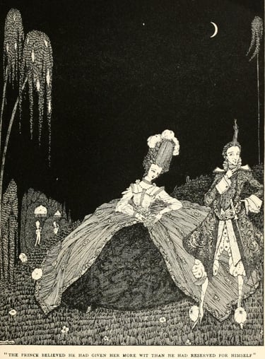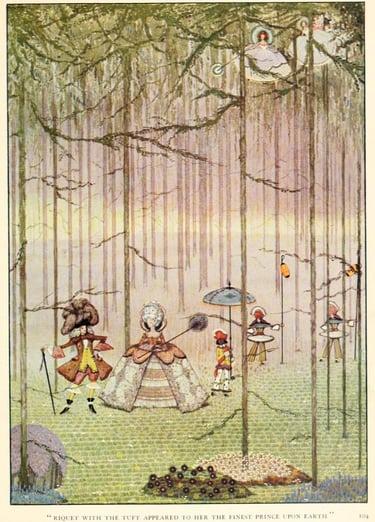 Harry Clark, illustrations pour Riquet with the Tuft (Riquet à la houppe) dans The fairy tales of Charles Perrault (Contes de Charles Perrault)(1922), London : Harrap, p. 93, 99, 105.