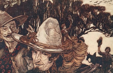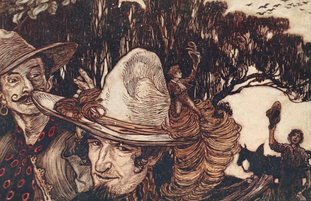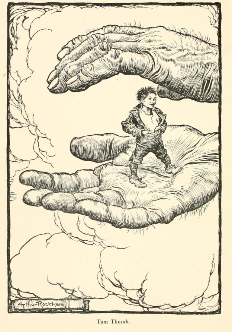 Arthur Rackham, illustrations pour Tom Thumb (Tom Pouce) dans The fairy tales of the Brothers Grimm (Contes des frères Grimm)(1916), trad. Mrs Edgar Lucas lithographie, New York ; Doubleday, p. 126, 129.